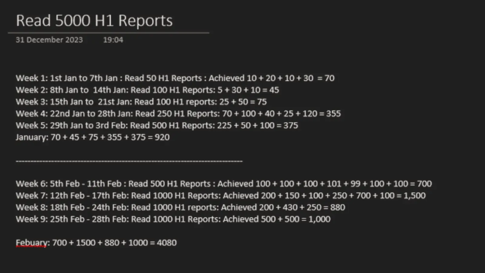 The process spanned nine weeks (approximately 60 days), with an average of 125 reports read daily, totaling nearly 99 hours of focused study.