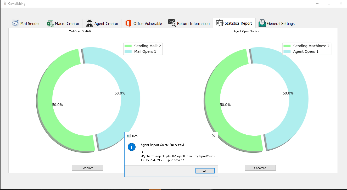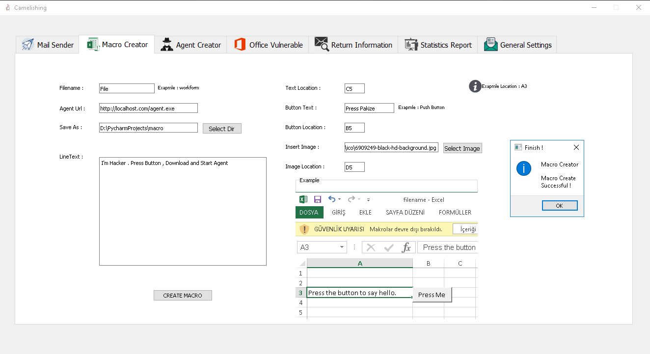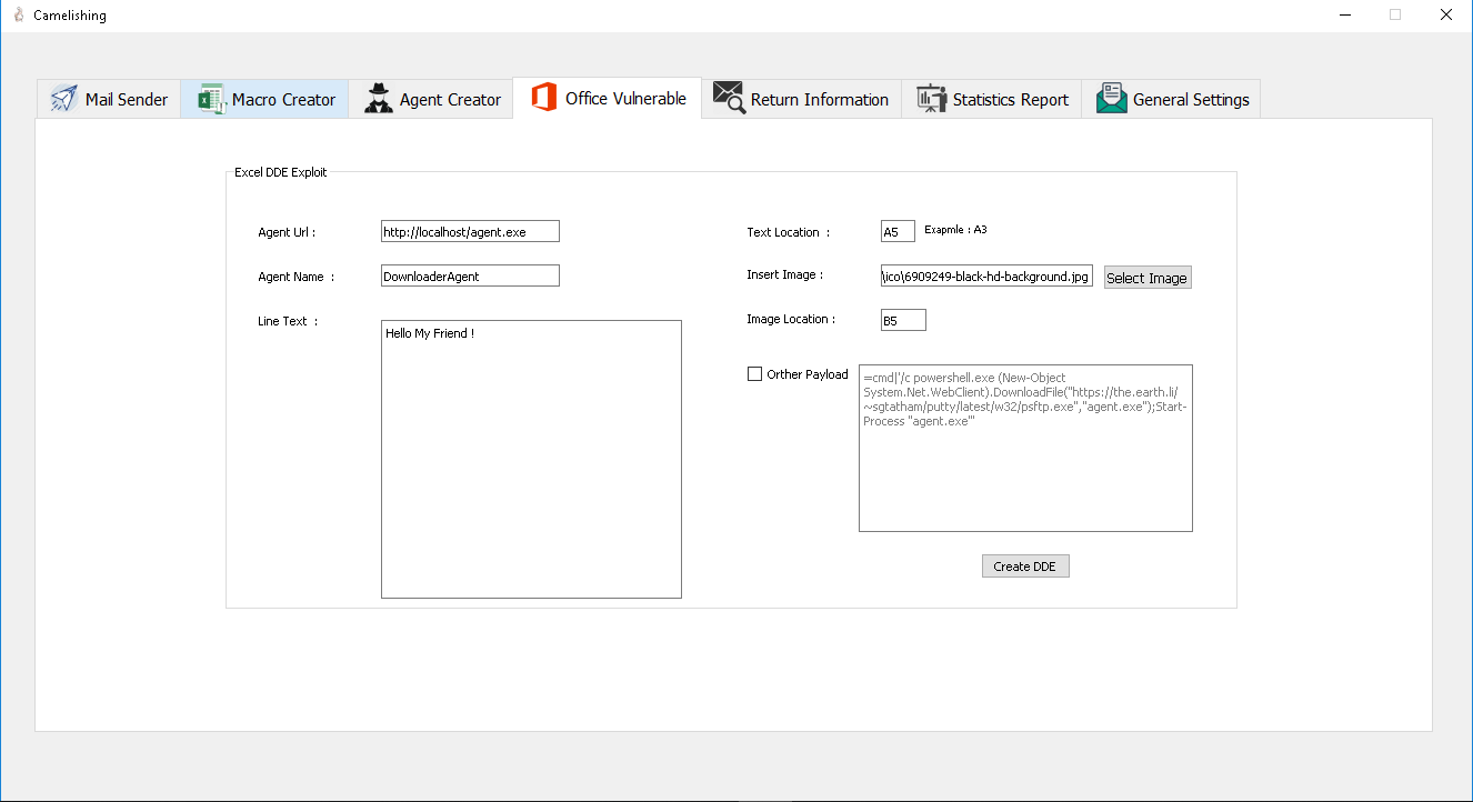 Camelishing is a Social Engineering tool with the features like Bulk email sending, Basic Python Agent Creator, Office Excel Macro Creator, DDE Excel Creator(or Custom Payload), Return İnformation, Mail Open Track,Agent Open Track, AutoSave, Statistics Report and User Control. Camelishing is supported in windows 7 and 10.