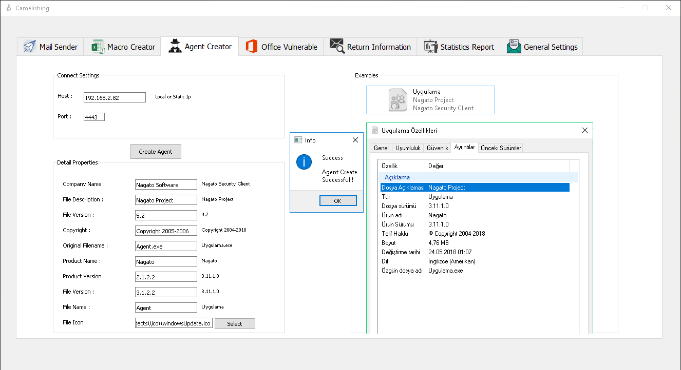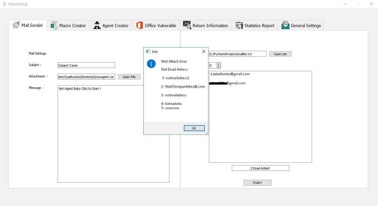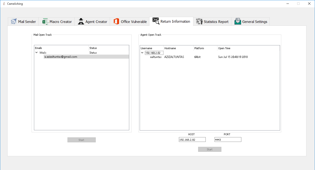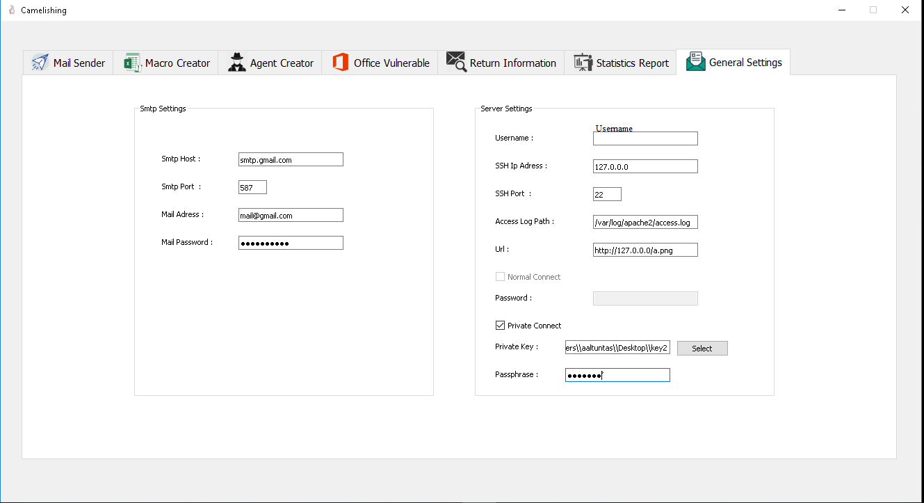 Camelishing is a Social Engineering tool with the features like Bulk email sending, Basic Python Agent Creator, Office Excel Macro Creator, DDE Excel Creator(or Custom Payload), Return İnformation, Mail Open Track,Agent Open Track, AutoSave, Statistics Report and User Control. Camelishing is supported in windows 7 and 10.