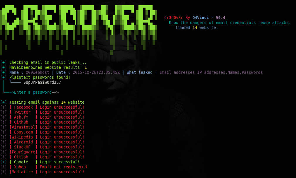 Cr3dOv3r is know as the dangers of credential reuse attacks. It would be your best friend in credential reuse attacks. You give Cr3dOv3r an email then it does two simple useful jobs with it: