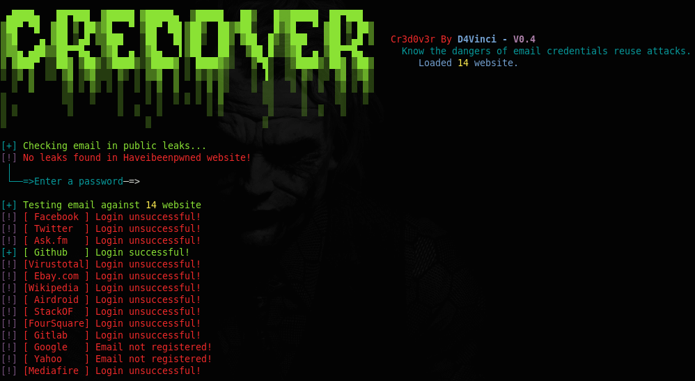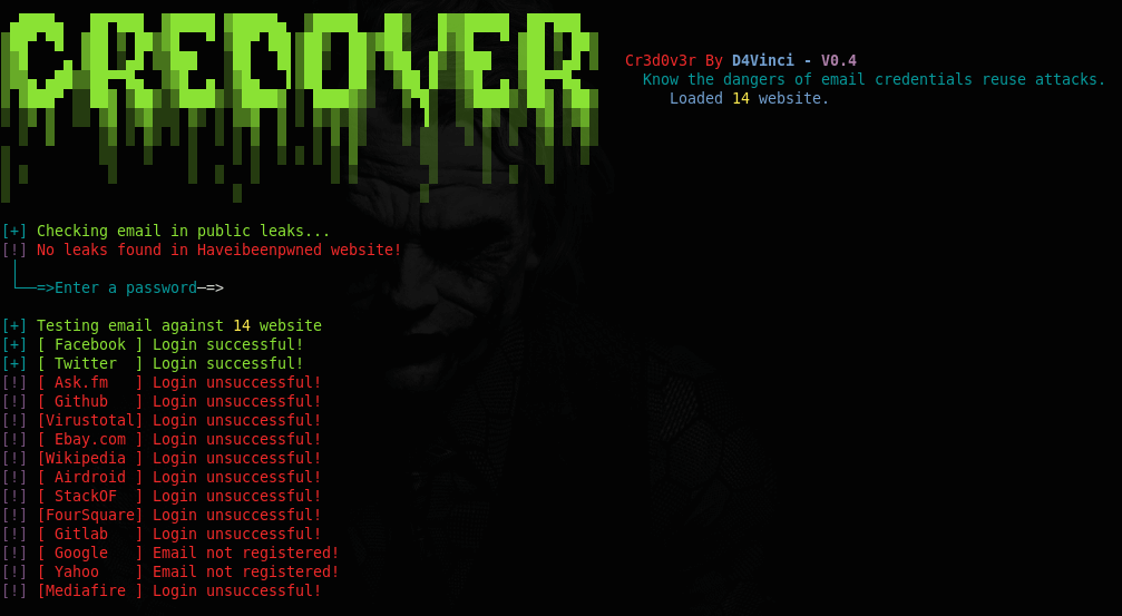 Cr3dOv3r is created to show how could credential reuse attacks get dangerous and it’s not responsible for misuse or illegal purposes. Use it only for Pen-test or educational purpose !!!