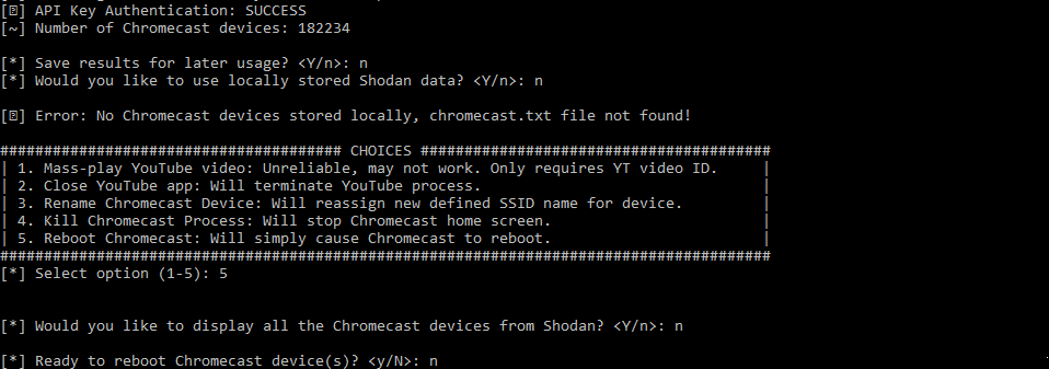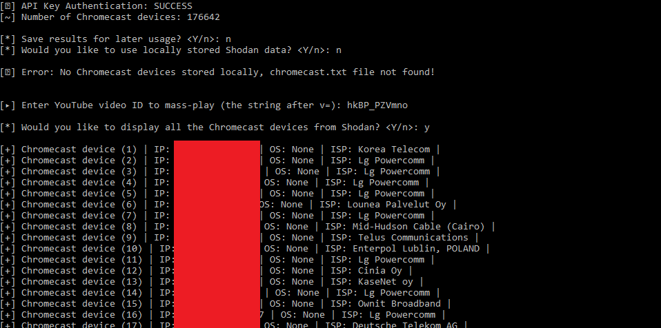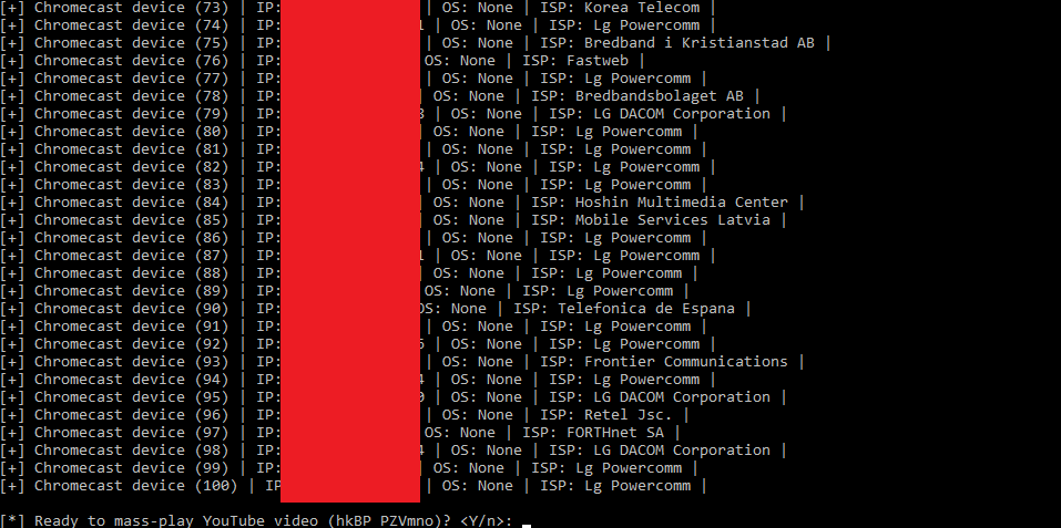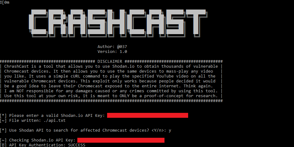 CRASHCAST mass-exploit tool allows you to mass play any YouTube video, remotely terminate apps, and rename Chromecast device(s) obtained from Shodan.io.