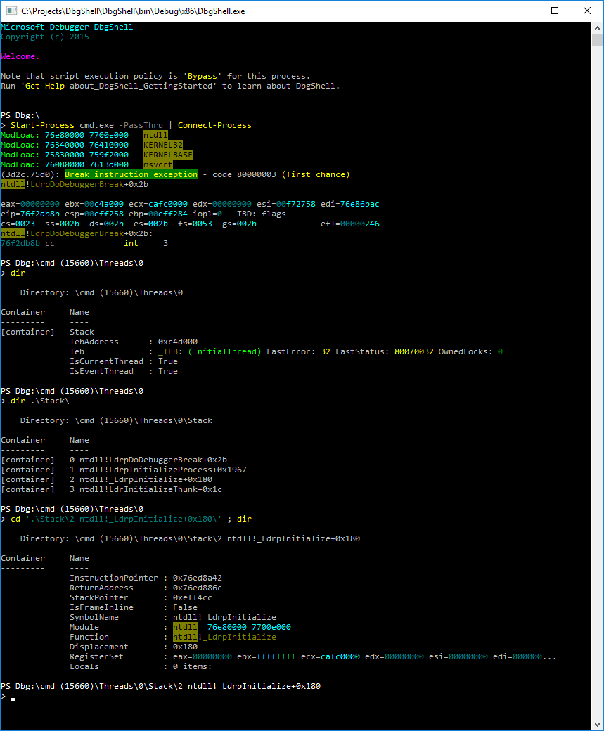 • a PowerShell “navigation provider”, which exposes aspects of a debugging target as a hierarchical namespace (so you can “cd” to a particular thread, type “dir” to see the stack, “cd” into a frame, do another “dir” to see locals/registers/etc.),