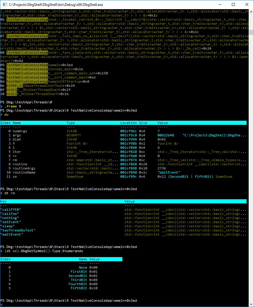 Here I have attached to a test program, and looked at the stack, switched to a particular stack frame, dumped locals, inspected the value of a local std::map, and inspected some type information for a local enum value. Note the display of the enumeration value: not only does DbgShell handle looking up the symbolic name for single enumerands, but also when multiple enumerands are OR’ed together. You can’t tell this from the screenshot, but there is tab completion for all of this stuff.