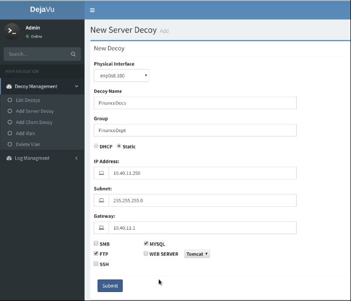 - Provide the details for new decoy as shown below. Select the services (SMB/FTP/MySQL/FTP/Web Server/SSH) to be deployed, use dynamic or provide a static IP address.