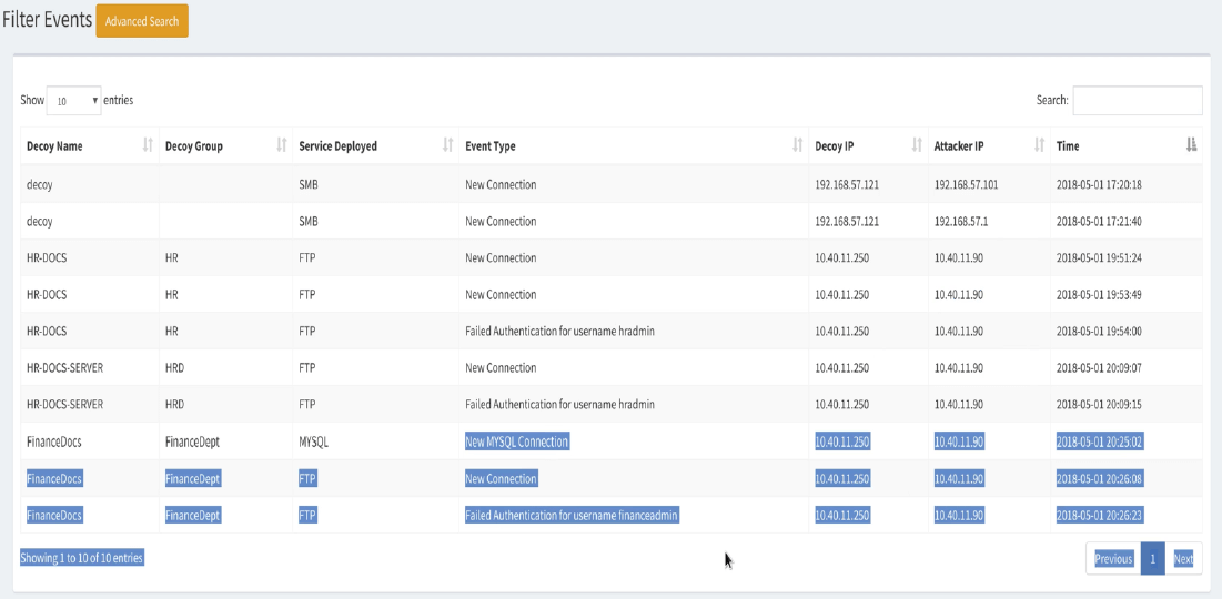- View the alerts triggered when the attacker scanned our decoy and tried to authenticated.