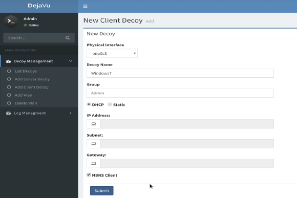 - Provide the details for new decoy as shown below. It’s recommended to place the client decoy on user VLANs to detect responder/LLMNR attacks.