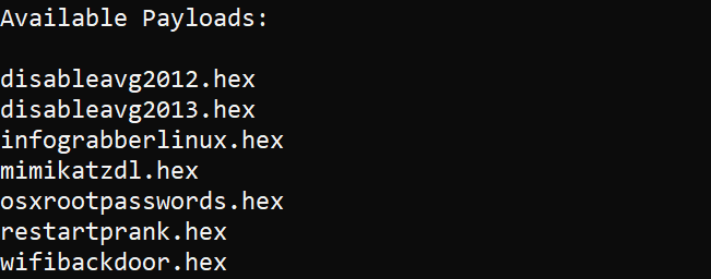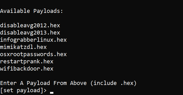 All the current payloads are from Hak5’s RubberDucky scripts available here. If you are unsure of what a payload may do this is the place to go read about it. I’ll try to keep the payloads close to the same name but I don’t want you on Windows to be typing out too much since rlcompleter doesn’t work.