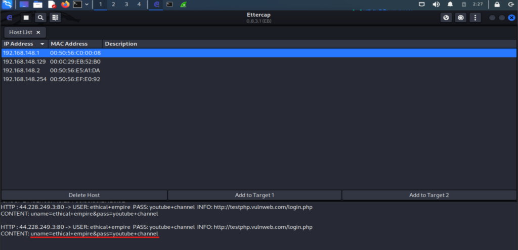 - Now on the attacker’s machine in ettercap, we can see the username and password we entered on that testing website on the victim’s machine.