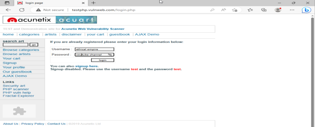 - We log in on the victim’s machine using the username and password. I am using a testing site, i.e, vulnweb.
