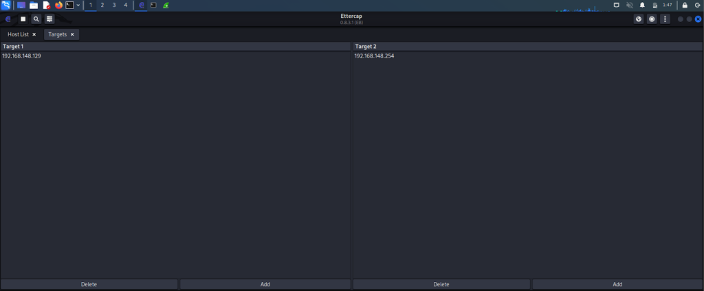 - We have to set the IP address of the victim machine as Target 1 and the IP address of the server machine as Target 2.