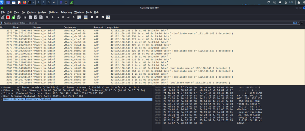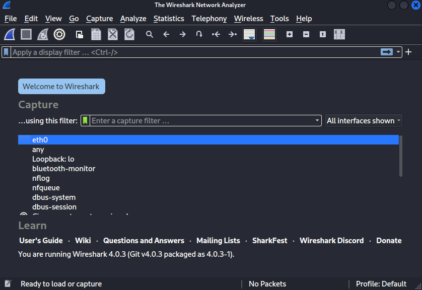 - Now we will open Wireshark on the attacker’s machine with the capture interface eth0