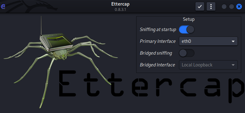 - Now we will open Ettercap on the attacker’s machine and set the primary interface to eth0.