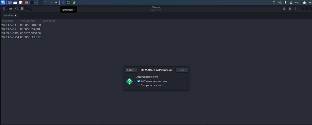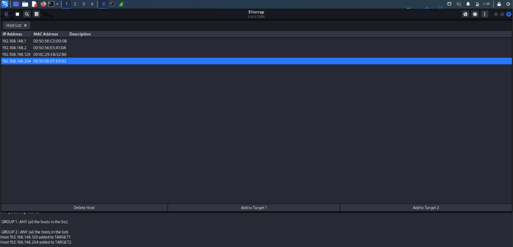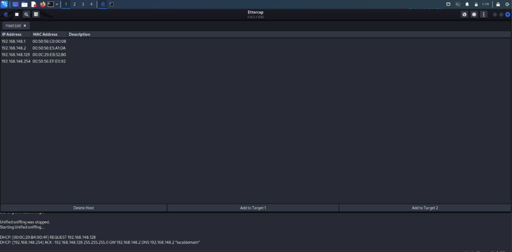 - After clicking the checkbox, unified sniffing starts on its own, and by selecting the opting host list on the top of the interface, we can see all the hosts connected with us. We can also see the IP address of the victim’s machine. i.e, 192.168.148.29.
