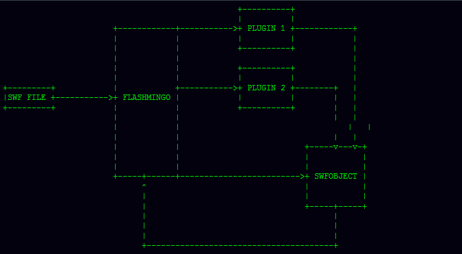 FLASHMINGO is designed with simplicity in mind. It reads a SWF file and creates an object (SWFObject) representing its contents and structure. Afterwards FLASHMINGO runs a series of plugins acting on this SWFObject and returning their values to the main program.