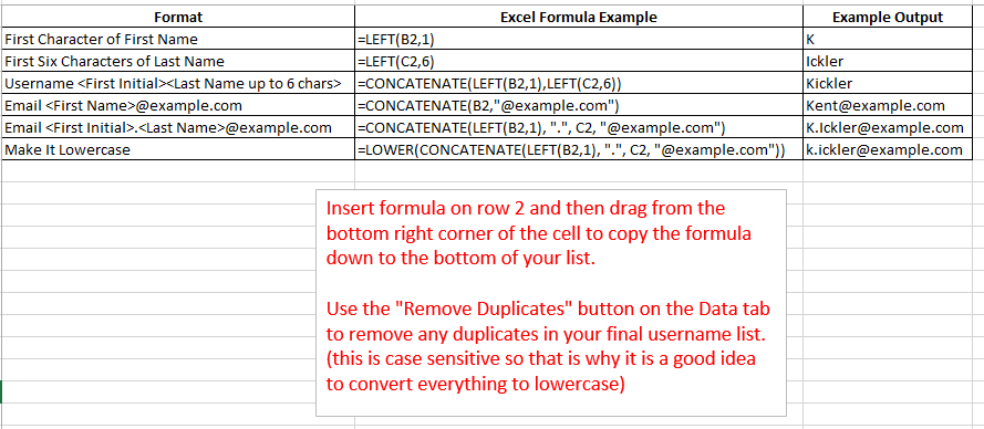 For those of you not familiar with Excel formula’s, here are some formulas for creating usernames and email addresses from the output above. (Assume column B contains the first name and column C contains the last name)