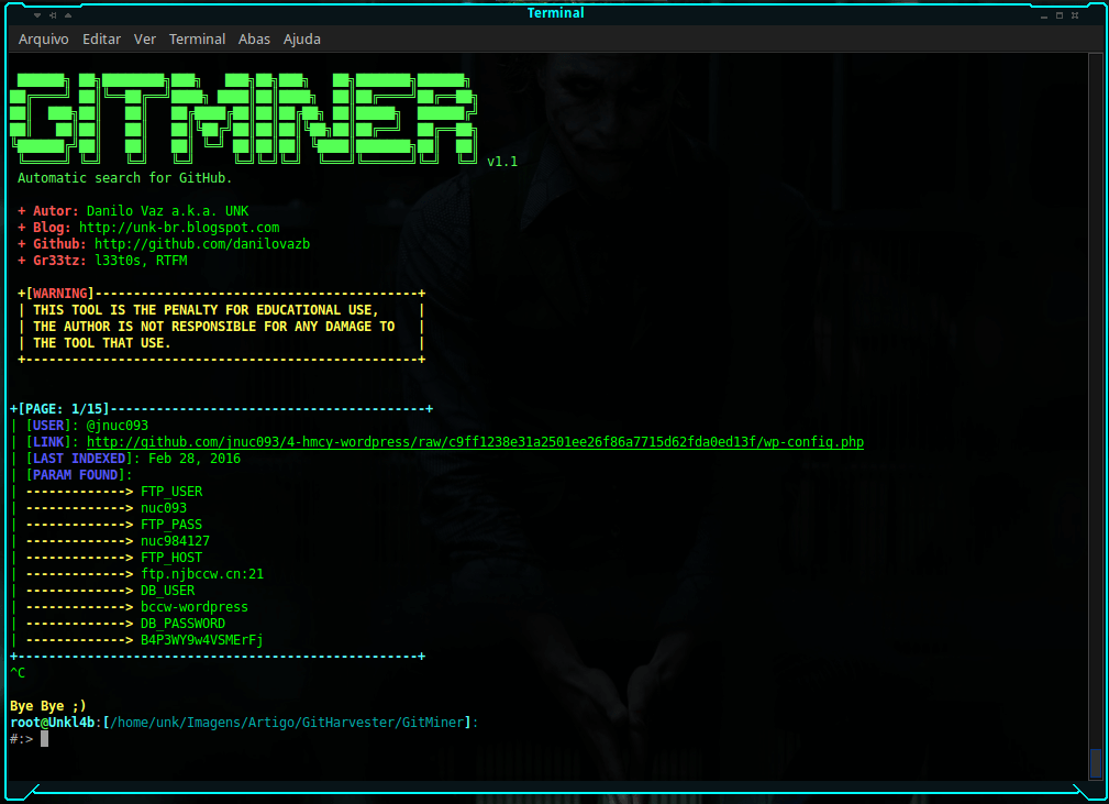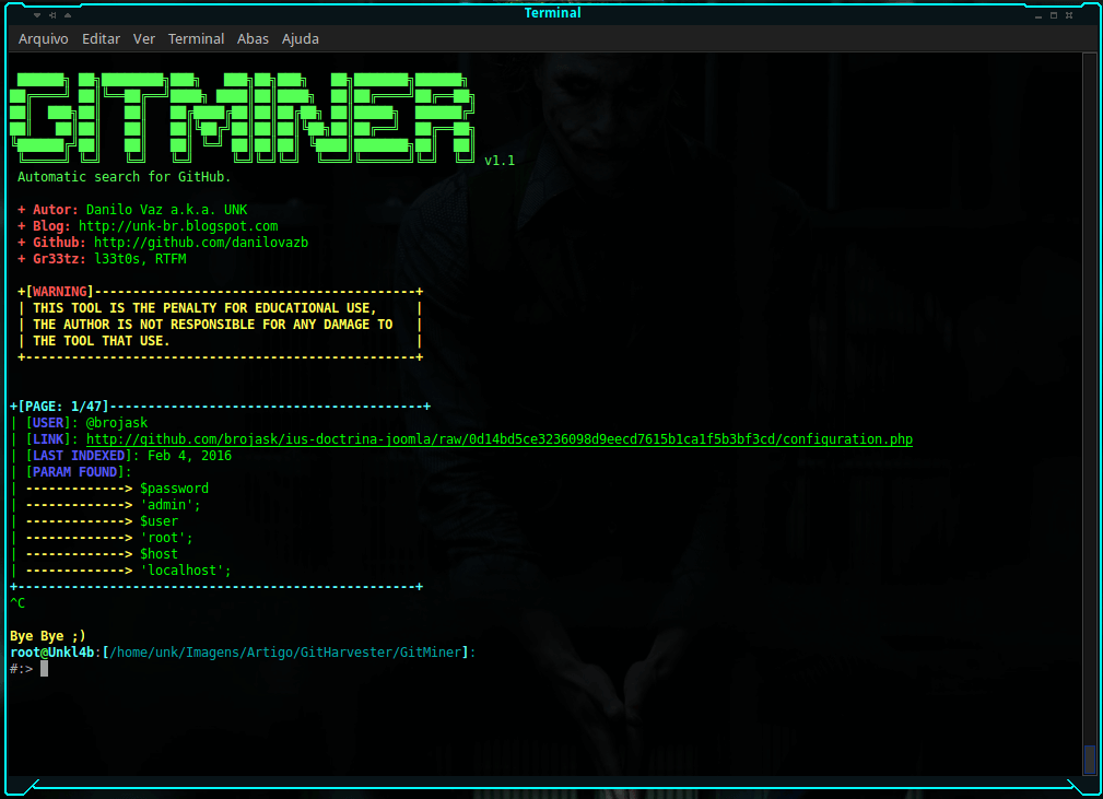 $:> python3 gitminer-v2.0.py --query 'extension:php "root" in:file AND "gov.br" in:file' -m senhas -c pAAAhPOma9jEsXyLWZ-16RTTsGI8wDawbNs4
