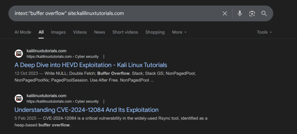 For Example [ intext:”buffer overflow” site:kalilinuxtutorials.com ]