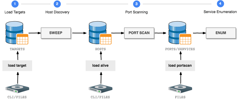 | Port Scanning | Perform a port scan: portscan <TYPE> <TARGET>Or upload nmap results from XML files or folder: load portscan <path-to-file> |