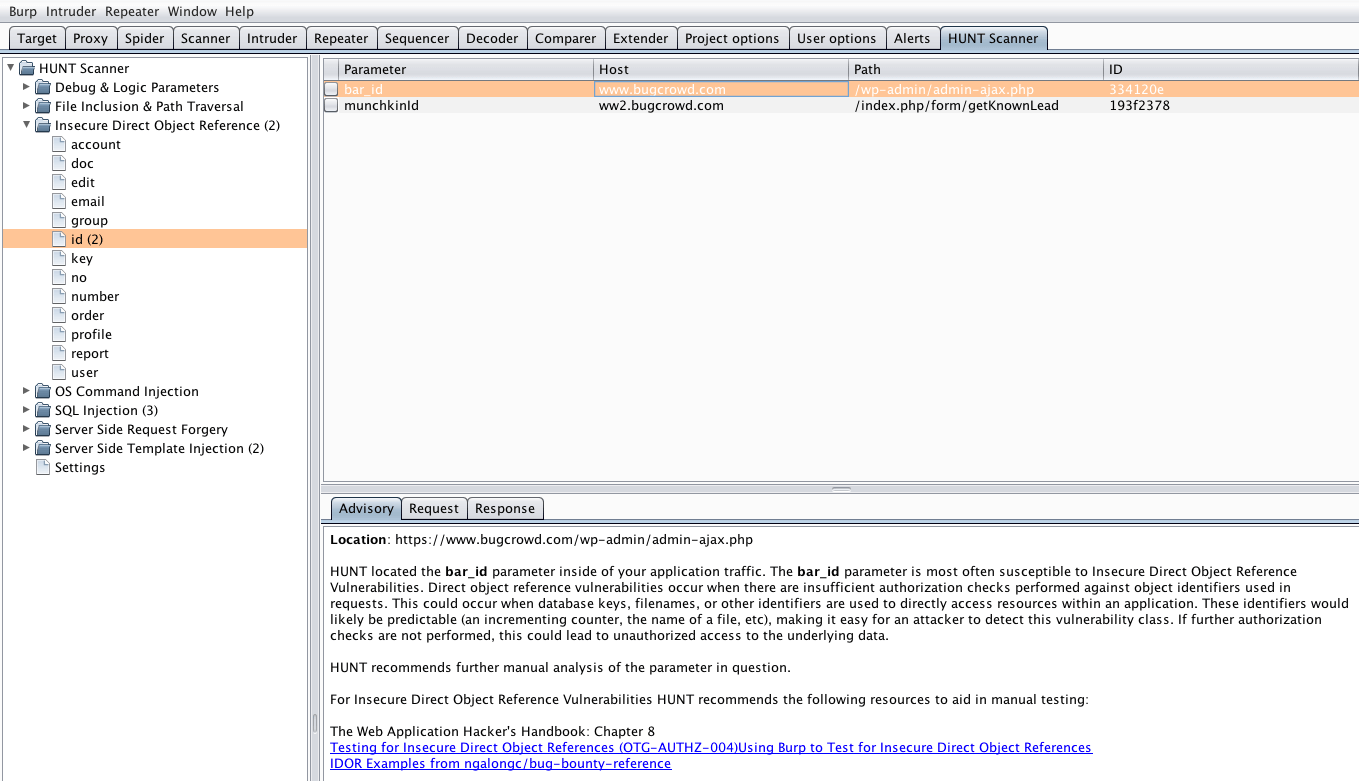 This extension does not test these parameters, but rather alerts on them so that a bug hunter can test them manually. For each class of vulnerability, Bugcrowd has identified common parameters or functions associated with that vulnerability class. We also provide curated resources in the issue description to do thorough manual testing of these vulnerability classes.