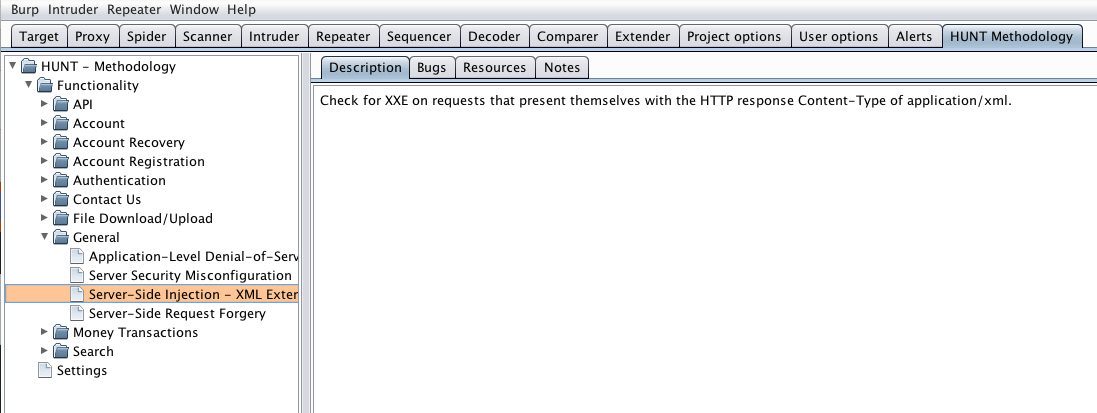This extension allows testers to send requests and responses to a Burp Suite tab called “HUNT Methodology”. This tab contains a tree on the left side that is a visual representation of your testing methodology. By sending request/responses here testers can organize or attest to having done manual testing in that section of the application or having completed a certain methodology step.