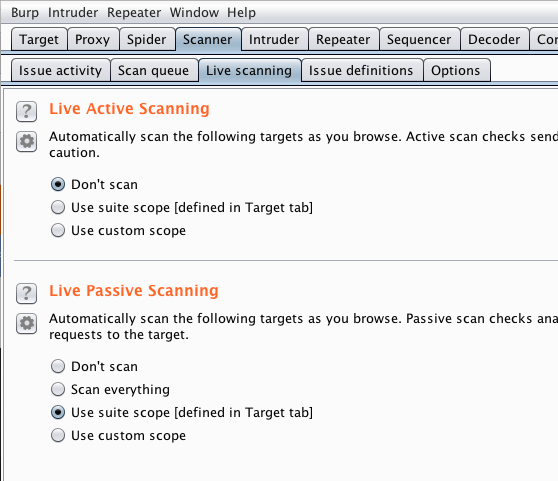 • Under the “Live Passive Scanning” section, click “Use suite scope [defined in the target tab]”.