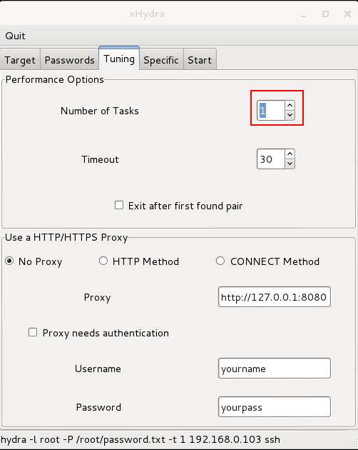 Step 4: Set no of tasks to 1 in tuning tab since this will reduce congestion & chance of detection. But takes longer to complete. This is also necessary to mitigate account lockout duration.
