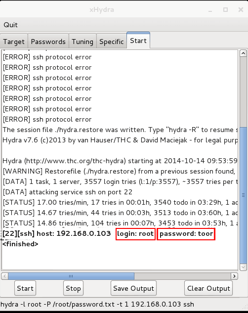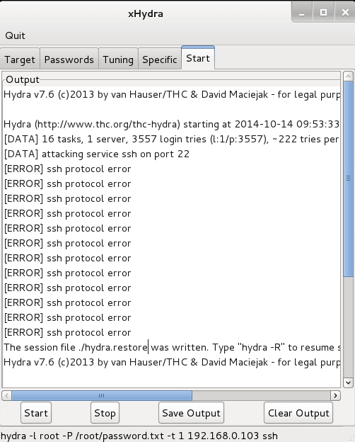 In this lab we try to break an ssh authentication on a remote has who has IP address 192.168.0.103. Here we do a wordlist attack by using a wordlist containing most common passwords to break into the root account.