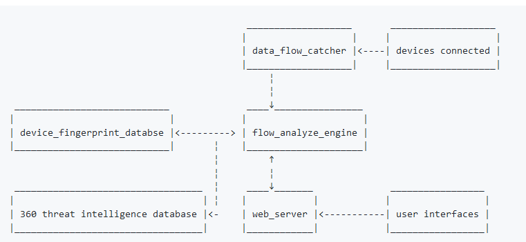 - Device fingerprint database: Normal network behaviors of each devices, based on whitelist. Call APIs of 360 threat intelligence database (https://ti.360.net/).