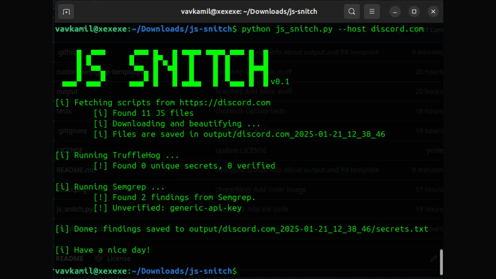 After scanning, JS Snitch organizes its findings in a structured output directory. The folder structure includes: