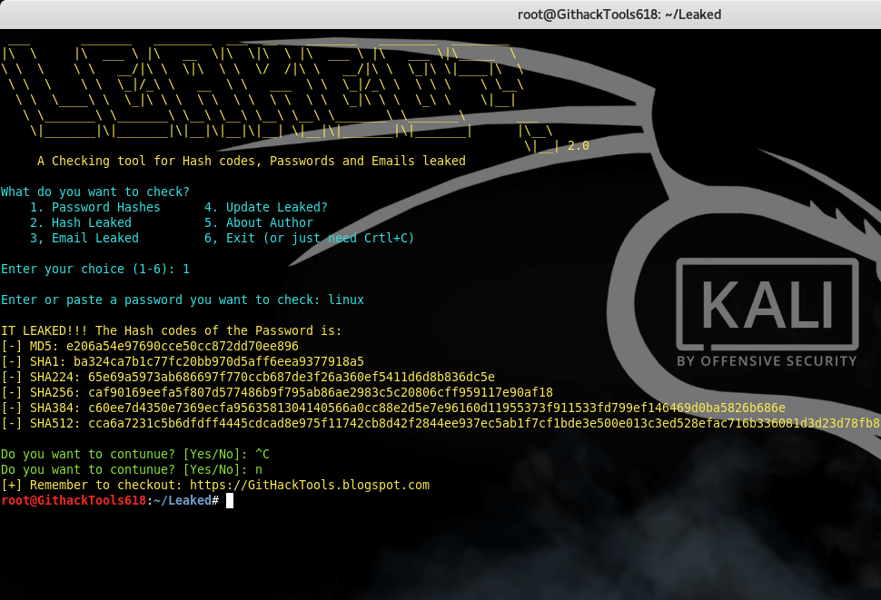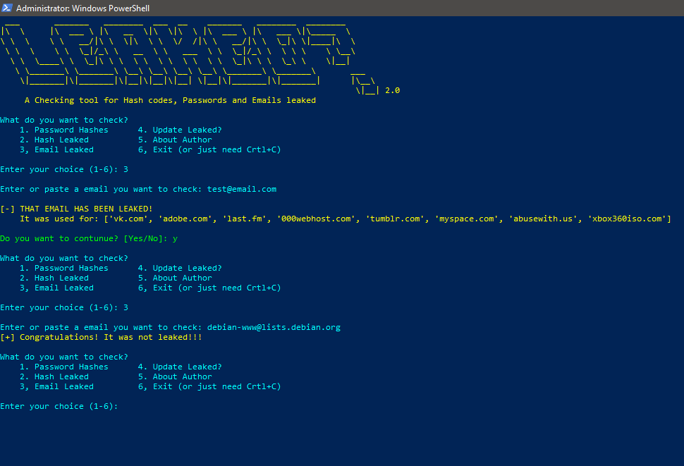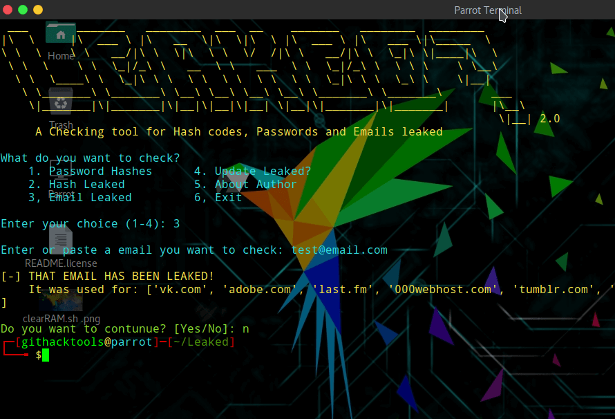 Leaked 2.0 is A Checking tool for Hash codes and Passwords and Emails leaked, uses leakz module from Aidan Holland, and leakz module uses API from Aurelius Wendelken.
