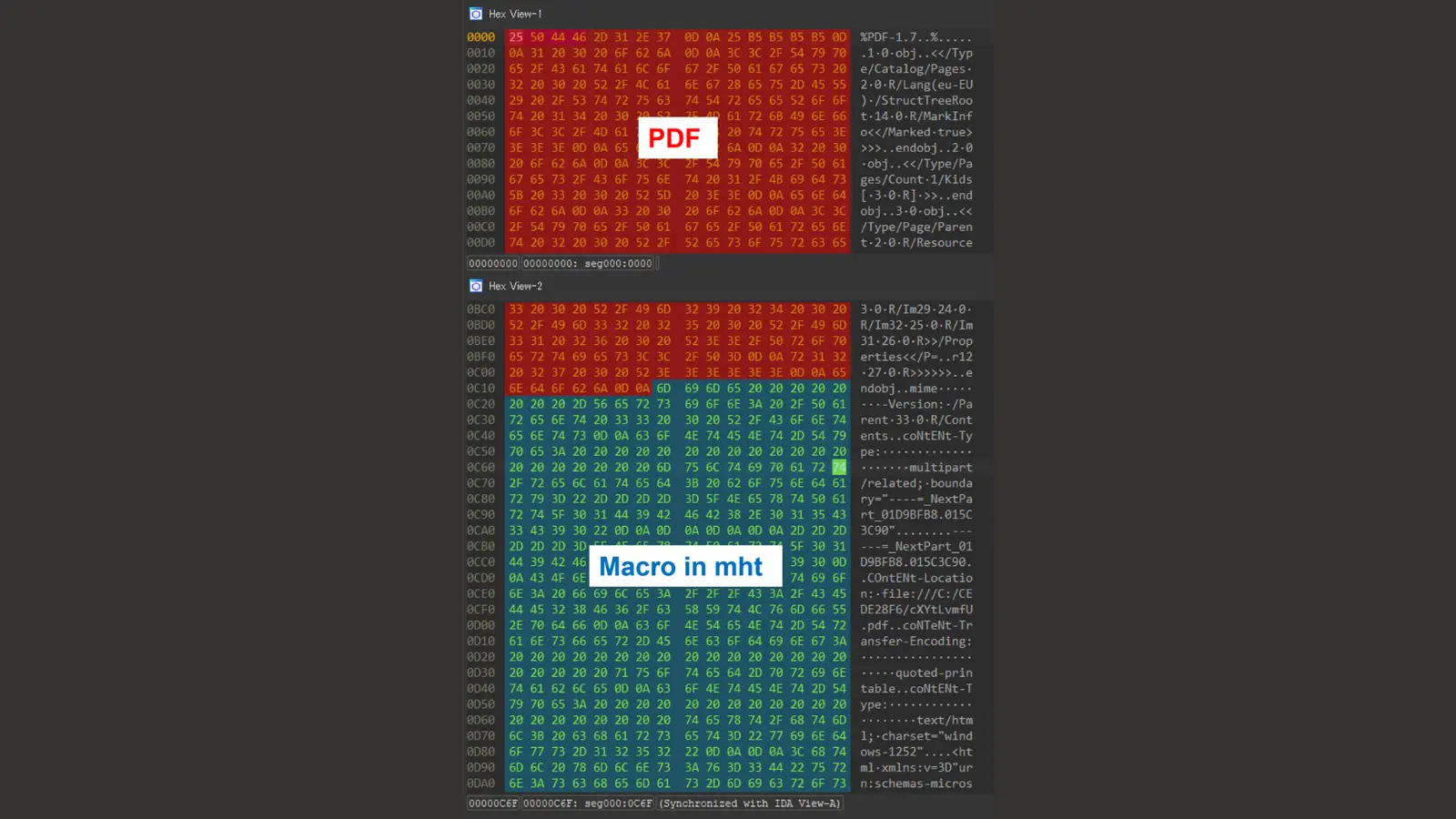 1. Embedding Malicious Content: Attackers append an MHT file created in Word, containing malicious macros, to the end of a PDF file. This results in a file that maintains a PDF signature but can also be opened in Word.