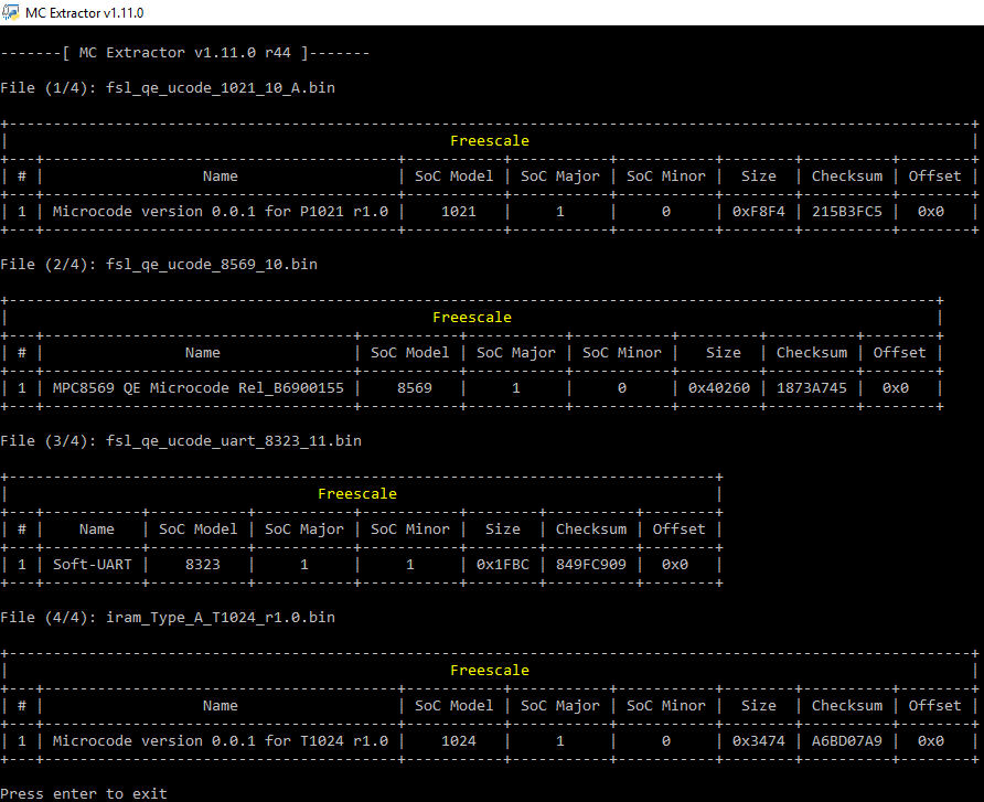MCExtractor is a tool which parses Intel, AMD, VIA and Freescale processor microcode binaries. It can be used by end-users who are looking for all relevant microcode information such as CPUID, Platform, Version, Date, Release, Size, Checksum etc.