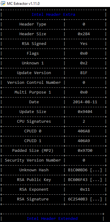 MCExtractor can be also used as a research analysis tool with multiple structures which allow, among others, full parsing & information display of all documented or not microcode Headers.