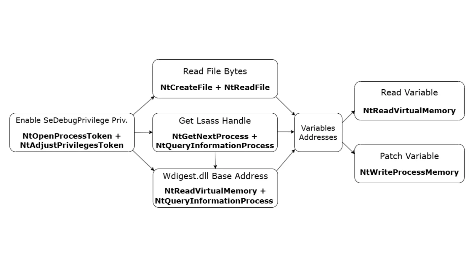 • NtCreateFile & NtReadFile: Access and read the WDigest.dll file.