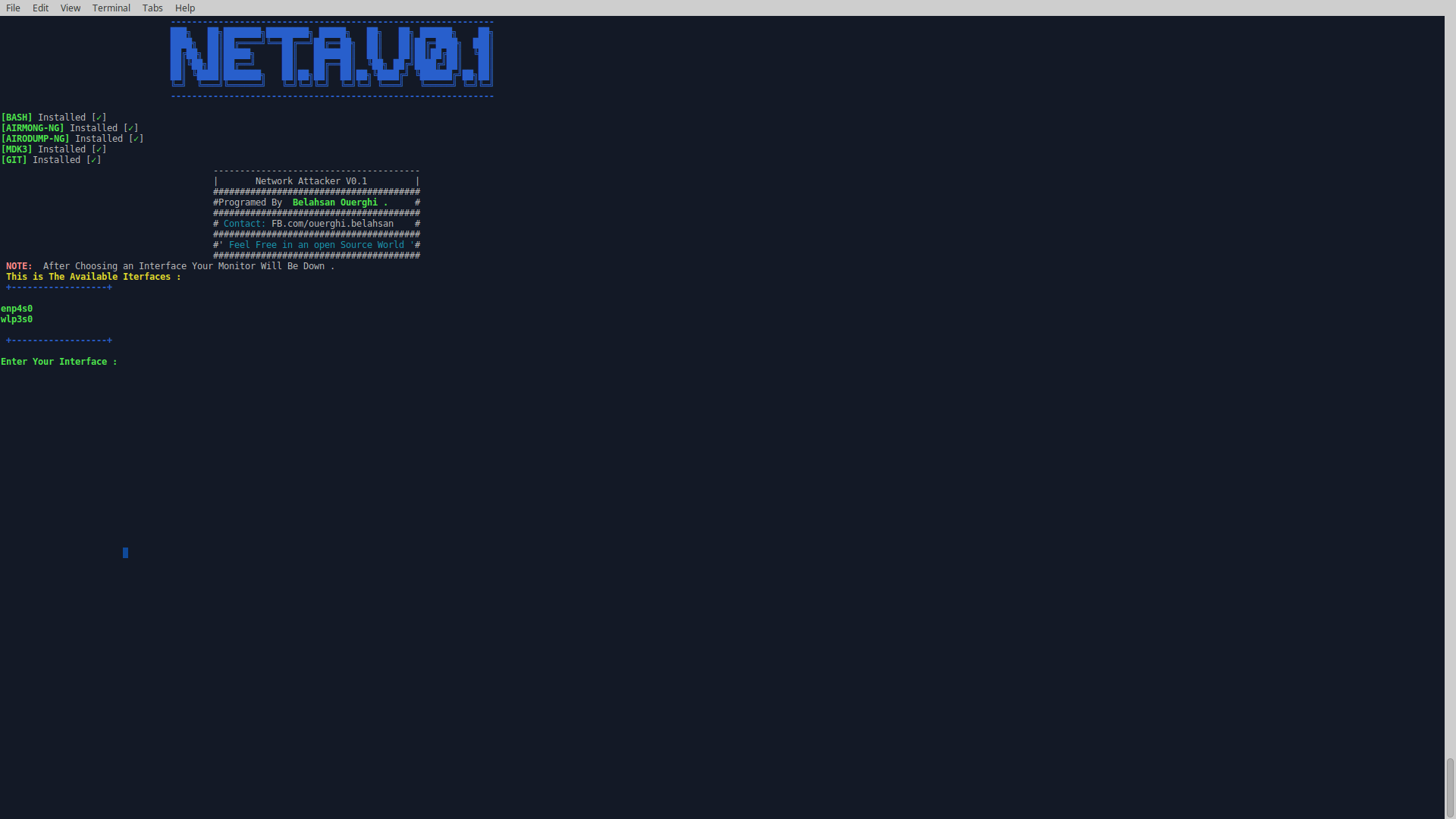 Network Attacker V0.1 is a Wifi Stress Testing Bash Script Program Based on Mdk3 Beacon Flooding & Deauthentication Attack. This was created to help beginners and even professionals for a eacon flooding Or deauthentication attack on networks.