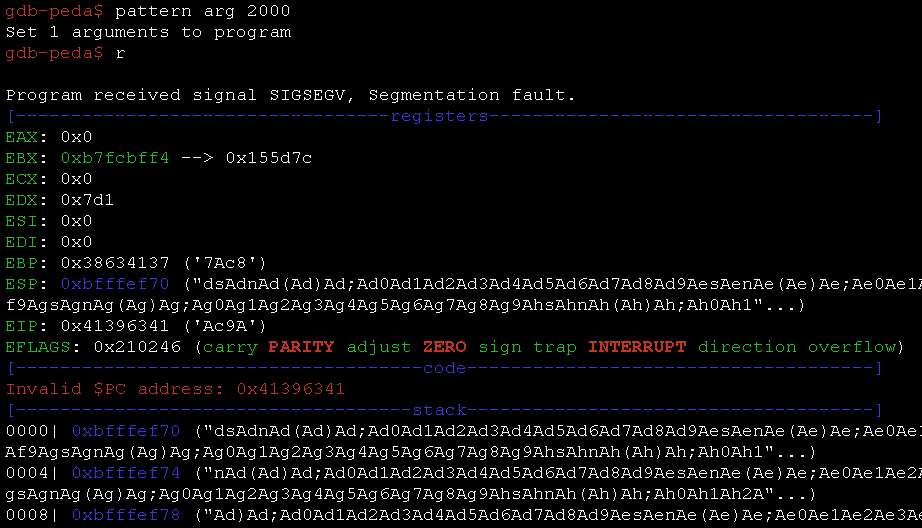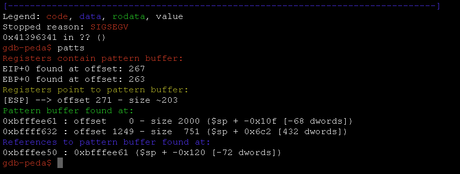 peda help):aslr— Show/set ASLR setting of GDBchecksec— Check for various security options of binarydumpargs— Display arguments passed to a function when stopped at a call instructiondumprop— Dump all ROP gadgets in specific memory rangeelfheader— Get headers information from debugged ELF fileelfsymbol— Get non-debugging symbol information from an ELF filelookup— Search for all addresses/references to addresses which belong to a memory rangepatch— Patch memory start at an address with string/hexstring/intpattern— Generate, search, or write a cyclic pattern to memoryprocinfo— Display various info from /proc/pid/pshow— Show various PEDA options and other settingspset— Set various PEDA options and other settingsreadelf— Get headers information from an ELF fileropgadget— Get common ROP gadgets of binary or libraryropsearch— Search for ROP gadgets in memorysearchmem|find— Search for a pattern in memory; support regex searchshellcode— Generate or download common shellcodes.skeleton— Generate python exploit code templatevmmap— Get virtual mapping address ranges of section(s) in debugged processxormem— XOR a memory region with a key