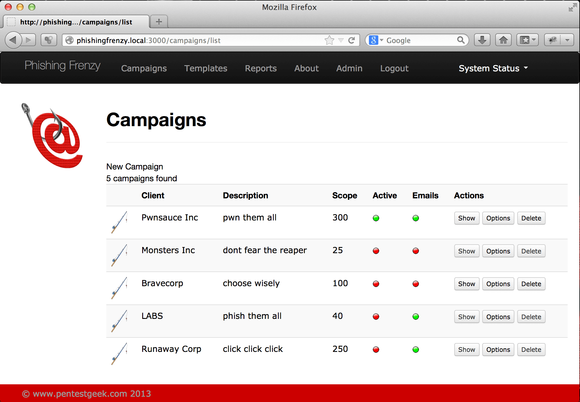 Phishing Frenzy is an Open Source Ruby on Rails application that is leveraged by penetration testers to manage email phishing campaigns.