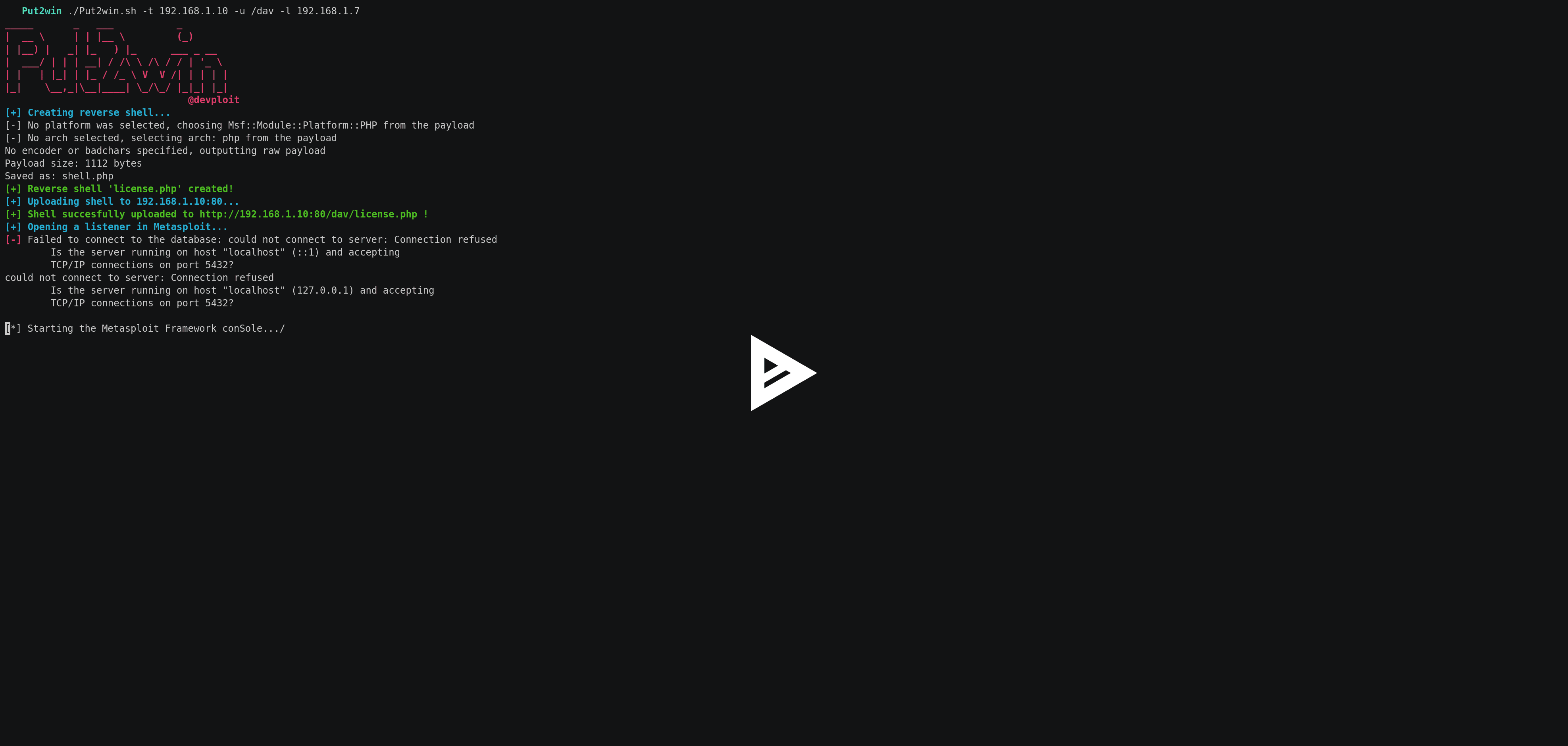 Put2Win is a script to automatize shell upload by PUT HTTP method to get meterpreter. It’s necessary to have installed nmap and msfvenom tools for a correct operation.