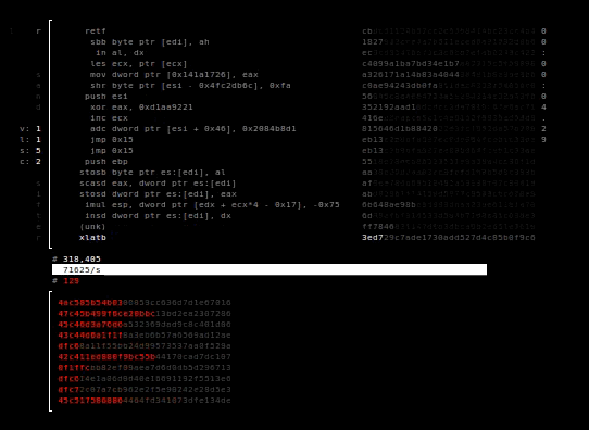 The computer is systematically scanned for anomalous instructions. In the upper half, you can view the instructions that the sandsifter is currently testing on the processor. In the bottom half, the sandsifter reports anomalies it finds.