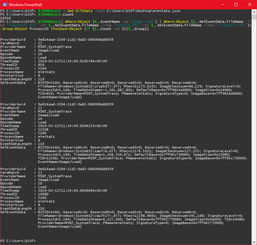SilkETW.exe -t kernel -kk ImageLoad -ot file -p C:\Users\b33f\Desktop\mimikatz.json