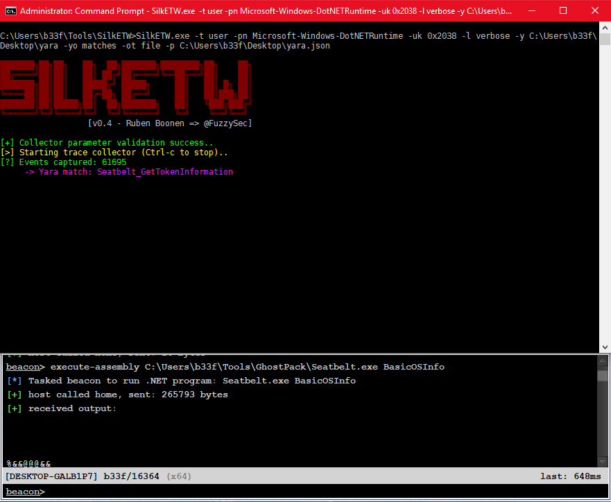 In this example we will use the following Yara rule to detect Seatbelt execution in memory through Cobalt Strike’s execute-assembly.