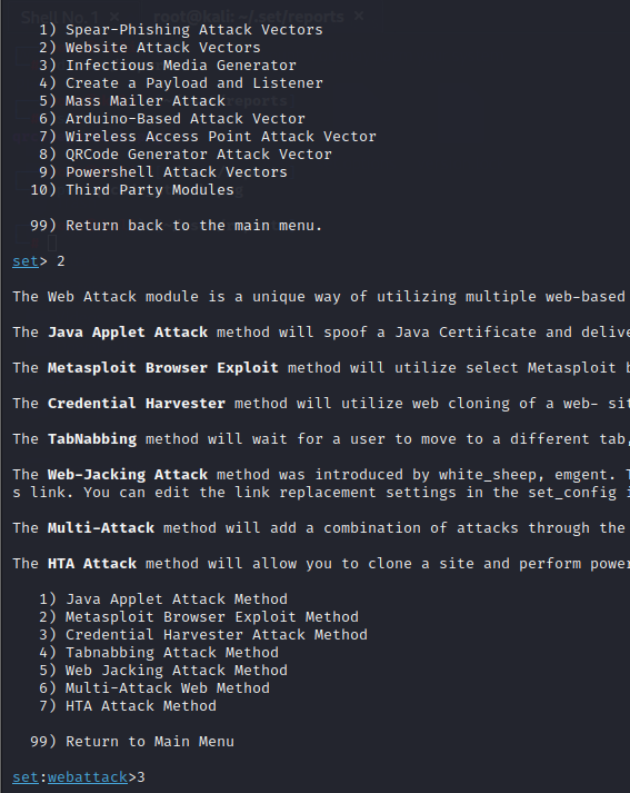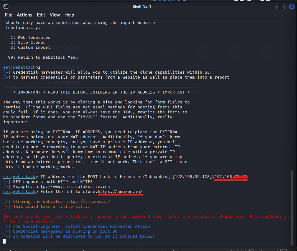 • Select Credential Harvester Attack Method -> Site Cloner -> Press Enter -> Enter URL to clone.