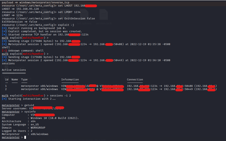Creating a  payload using Social Engineering Tool Kit in Kali Linux and exploiting it.