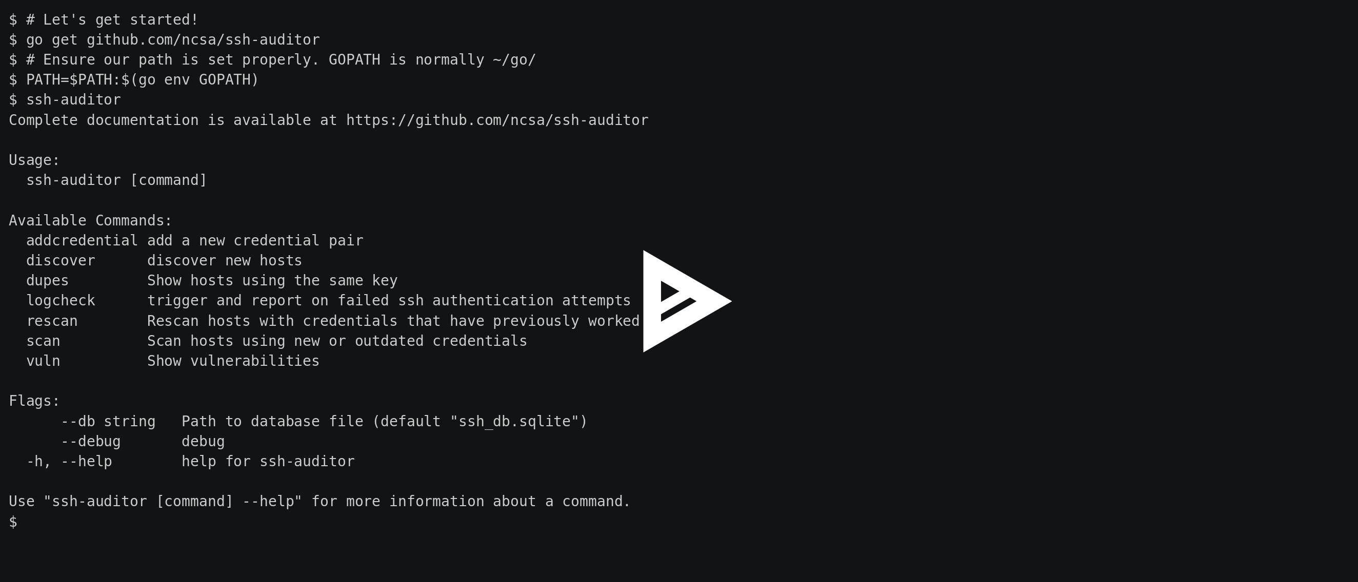 $ go get github.com/ncsa/ssh-auditor