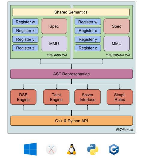 Triton is a Dynamic Binary Analysis (DBA) framework. It provides internal components like a Dynamic Symbolic Execution (DSE) engine, a Taint Engine, AST representations of the x86 and the x86-64 instructions set semantics, SMT simplification passes, an SMT Solver Interface and, the last but not least, Python bindings.