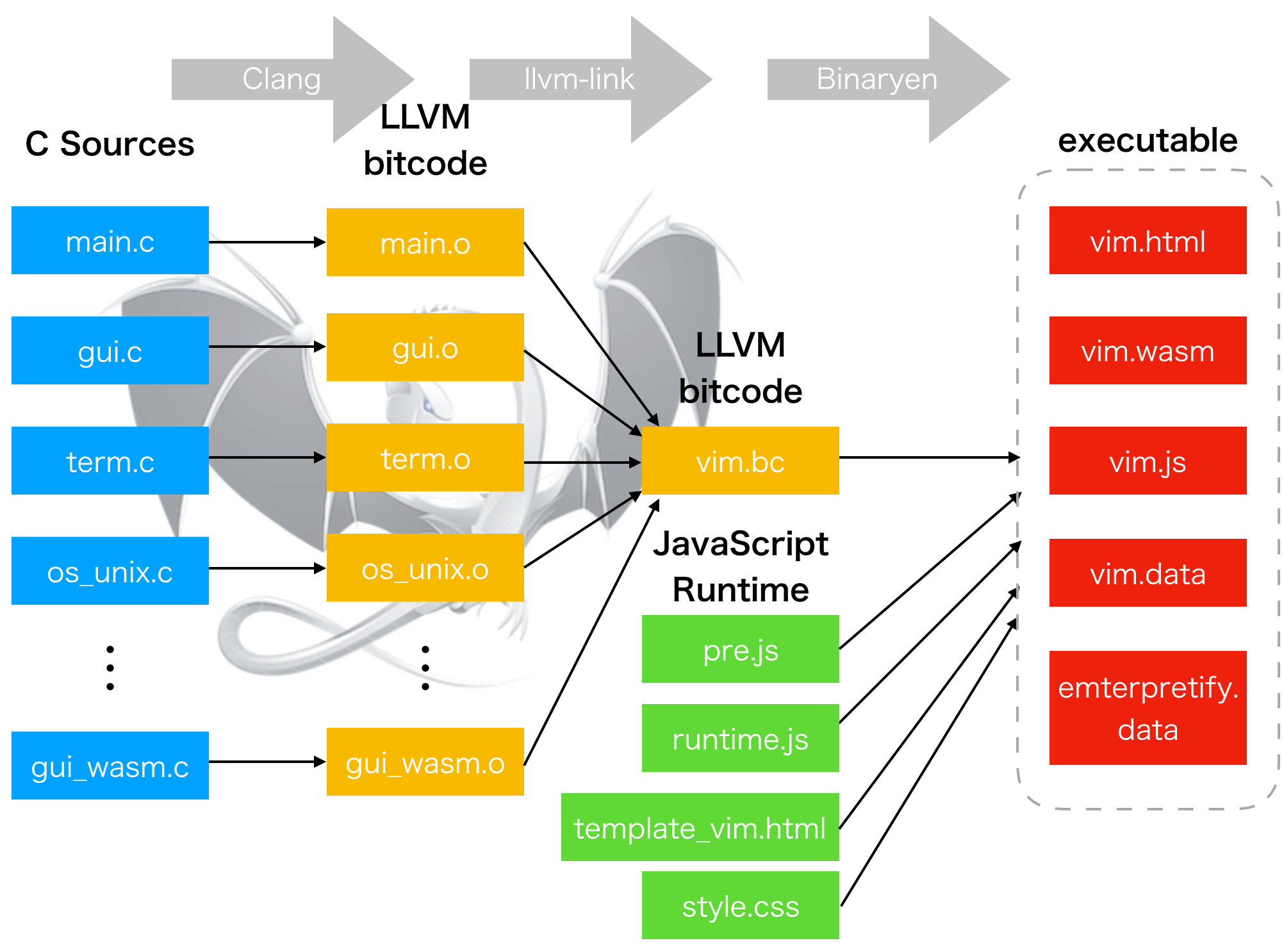 WebAssembly frontend for Vim is implemented as a new GUI frontend. C sources are compiled to each LLVM bitcode files and then they are linked to one bitcode file vim.bc by emcc. emcc finally compiles the vim.bc into vim.wasm binary using binaryen and generates HTML/JavaScript runtime.