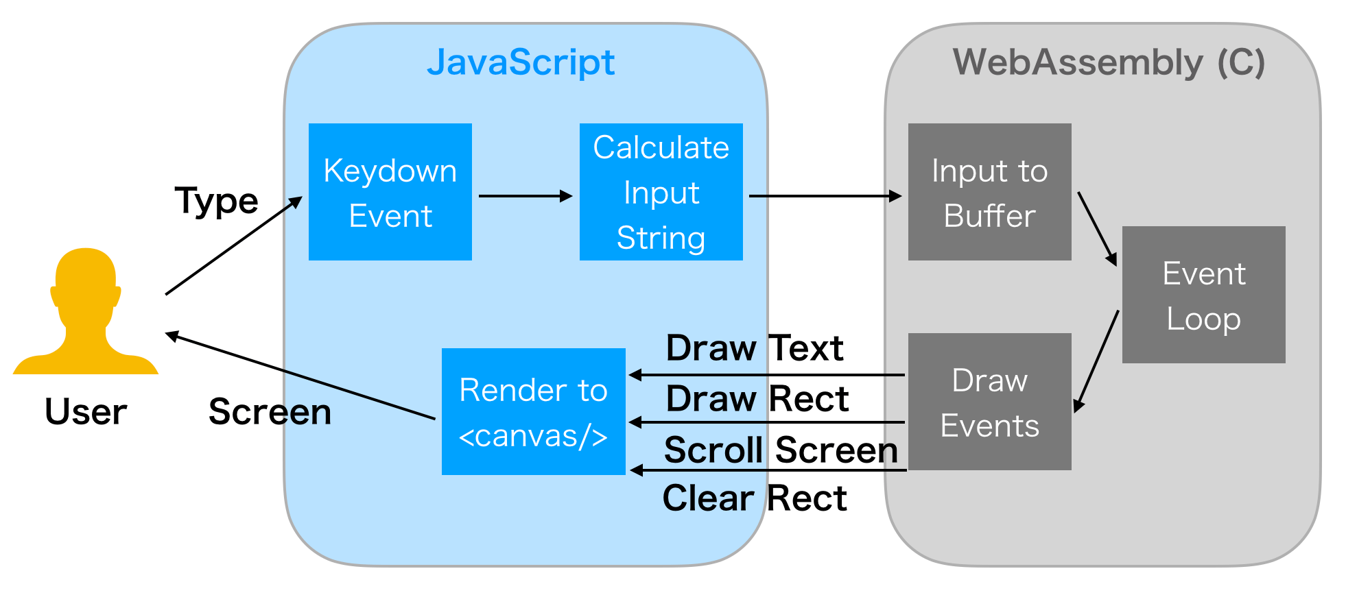User interaction is very simple. You input something with keyboard. Browser takes it as KeyboardEvent on keydown event and JavaScript runtime sends the input to Wasm thanks to emscripten’s JS to C API. Sent input is added to a buffer in C layer. It affects the editor’s state.